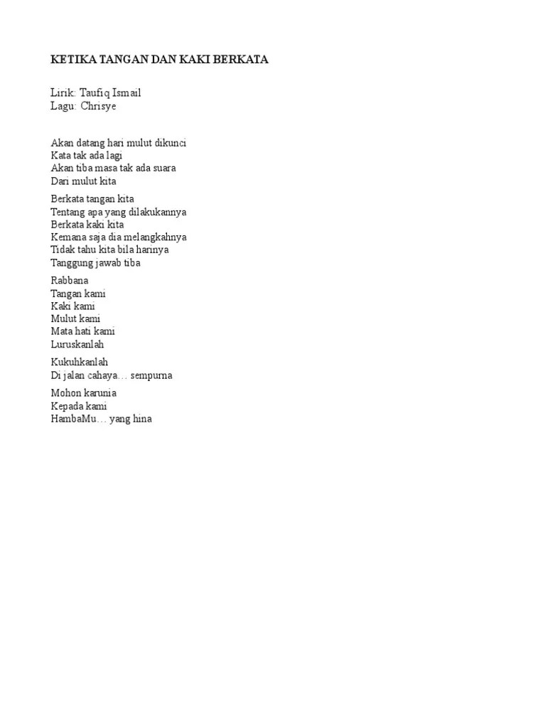 Akan datang hari mulut dikunci kata tak ada lagi akan tiba masa tak ada suara dari. Kaset lagu itu dikirimkannya, berikut keterangan berapa baris lirik. Mari kita bahas satu persatu lirik lagu tersebut dan dibandingkan dengan terjemahan surat yasin ayat 65. Akan tiba masa tak ada suara Ketika tangan dan kaki berkata lirik: Akan datang hari mulut dikunci. "pada hari ini kami akan tutup mulut mereka, dan tangan mereka akan berkata kepada . Ketika tangan dan kaki berkata chrisye jangan lupa like n follow maz_noe. Adalah lirik lagu karya taufik ismail dan dinyanyikan oleh chrisye. Ketika tangan dan kaki berkata lirik : Berikut cuplikan teks lagunya akan datang hari mulut dikunci, . Akan datang hari mulut dikunci. Lagu ini diciptakan oleh chrisye, taufik ismail dan masih berupa single yang.
